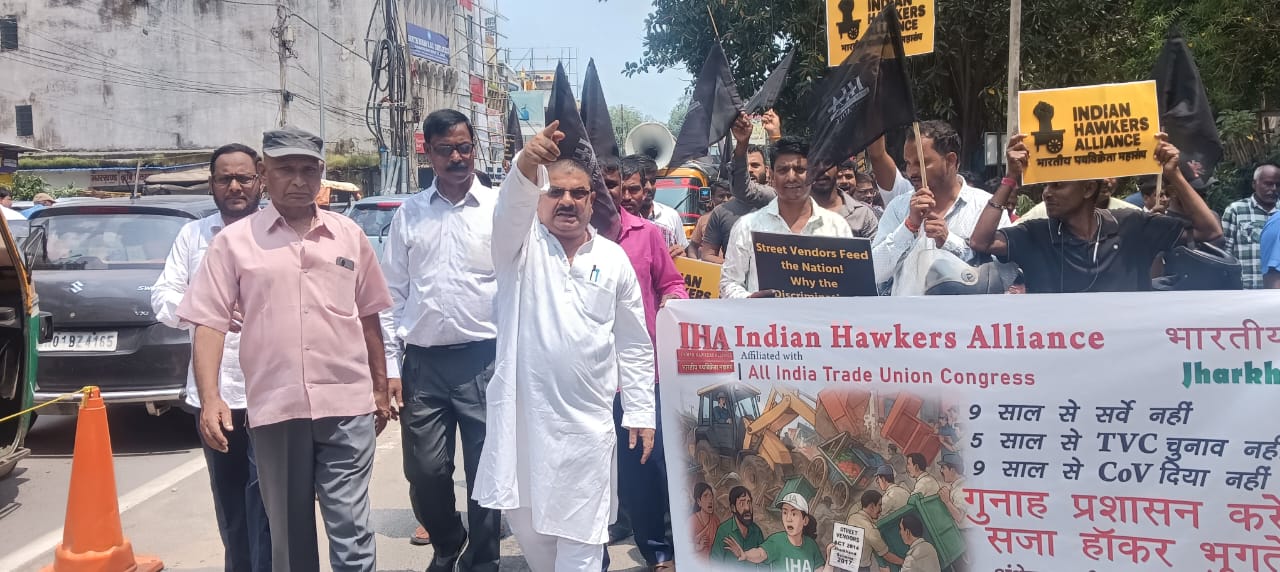 रांची। नगर निगम अधिकारियों की मनमानी और कार्रवाई से नाराज रांची फुटपाथ दुकानदार संघ के बैनर तले हजारों दुकानदार शुक्रवार को सड़कों पर उतर आए। जयपाल सिंह स्टेडियम से ऑल इंडिया ट्रेड यूनियन कांग्रेस (एआईटीयूसी) के बैनर तले जुलूस निकाला गया, जो राजभवन पहुंचकर घेराव कियासभा की अध्यक्षता संघ के नेता संदीप कुमार वर्मा ने की, जबकि संचालन विकास वर्मा ने किया। मौके पर भारतीय कम्युनिस्ट पार्टी के राज्य सचिव महेंद्र पाठक, एआईटीयूसी के महासचिव अशोक यादव, जिला सचिव अजय कुमार सिंह सहित कई नेता मौजूद रहे।सभा को संबोधित करते हुए महेंद्र पाठक ने आरोप लगाया कि बड़े-बड़े पूंजीपति और कॉरपोरेट घराने खुदरा व्यापार में उतरकर करोड़ों का निवेश कर रहे हैं और सरकारें उनके संरक्षण में ऑनलाइन और मॉल संस्कृति को बढ़ावा दे रही हैं। उन्होंने कहा कि “शहरों से फुटपाथ दुकानदारों को हटाकर पूंजीपतियों को फायदा पहुंचाने की साजिश हो रही है।”